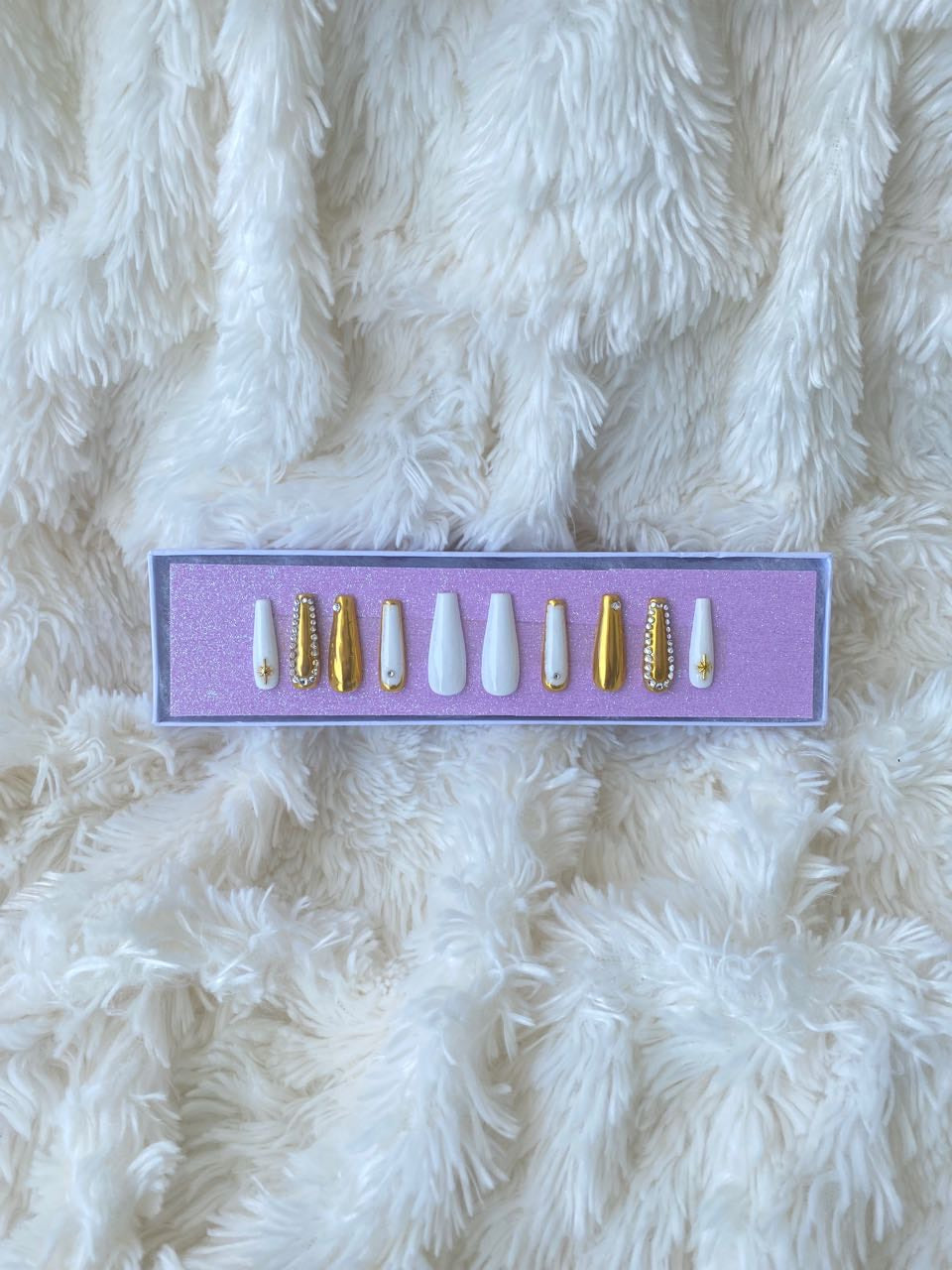 "Open Face" White and Gold Chrome Long Coffin Press-On Nails with Crystals | Set T26