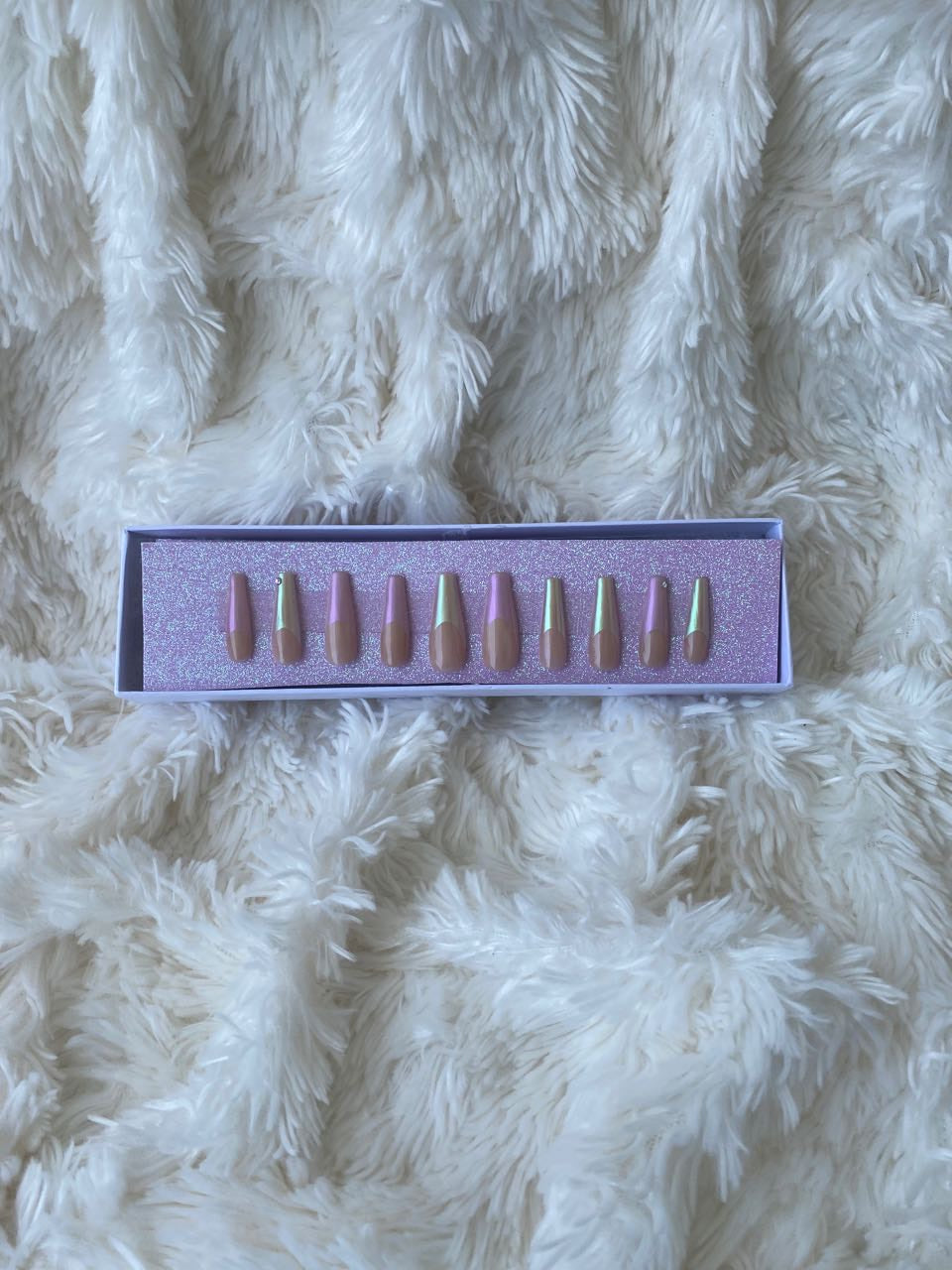 "Iridescent Frenchie" Iridescent Pink & Green French Tip Long Coffin Press-On Nails | Set T24