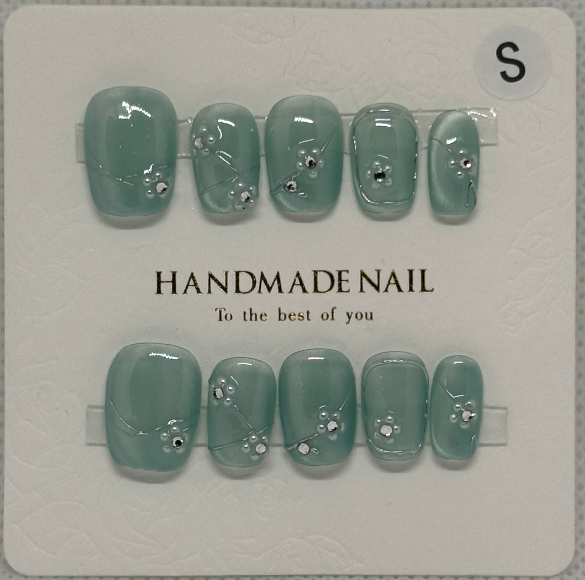 Nailstry's Sage set is a part of the Handmade collection featuring a refreshing sage hue with silver crystal petals.