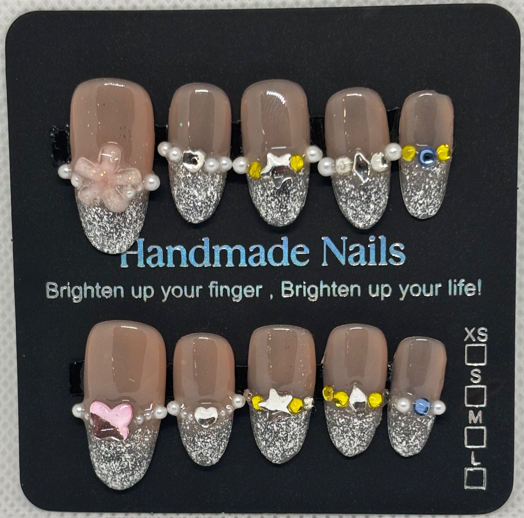 Nailstry's Sweet Shimmer set is a part of the Handmade collection featuring a silver glitter tips, pearls, and playful pastel accents.